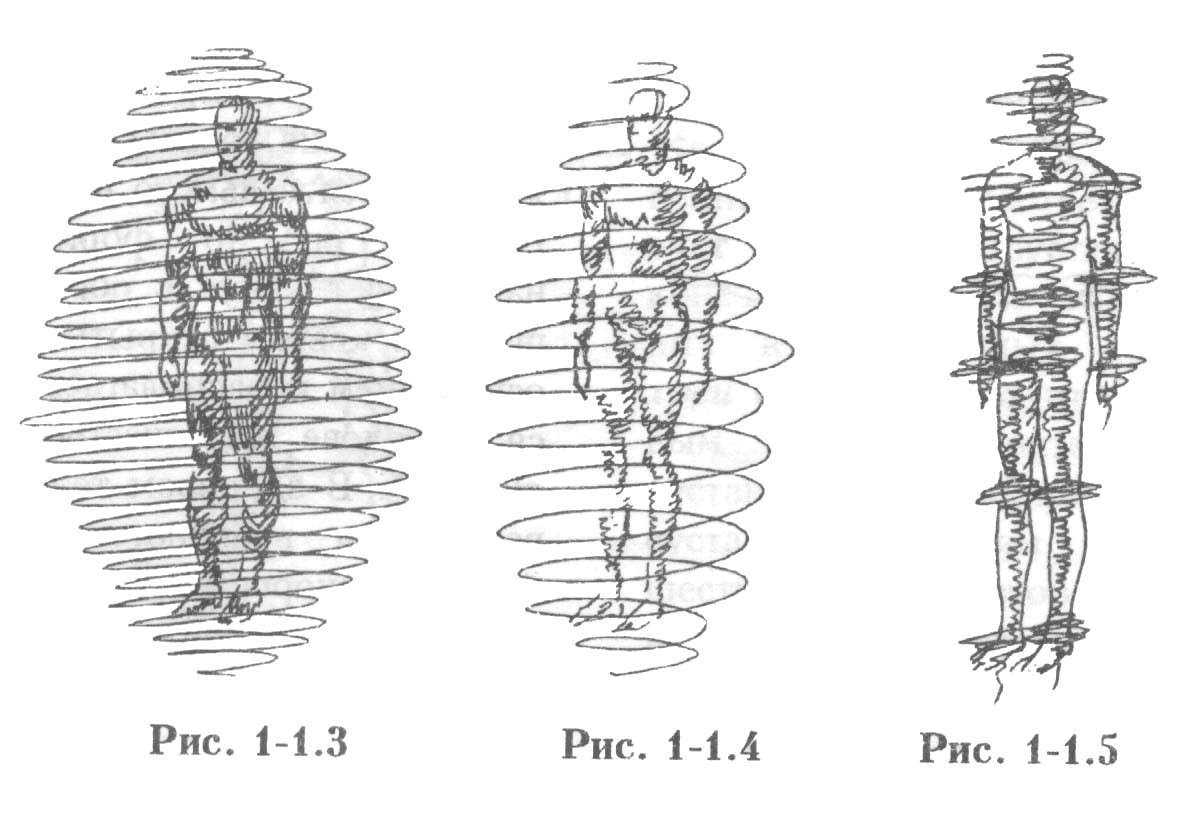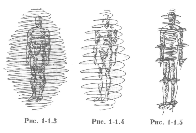 У нормального здорового человека внешние границы вихрей довольно далеко выходят за пределы тела. У особо мощных и развитых во всех отношениях индивидов все вихри сливаются в одно плотное вращающееся полевое образование, по форме напоминающее гигантское энергетическое яйцо (Рис. 1 – 1. 3).