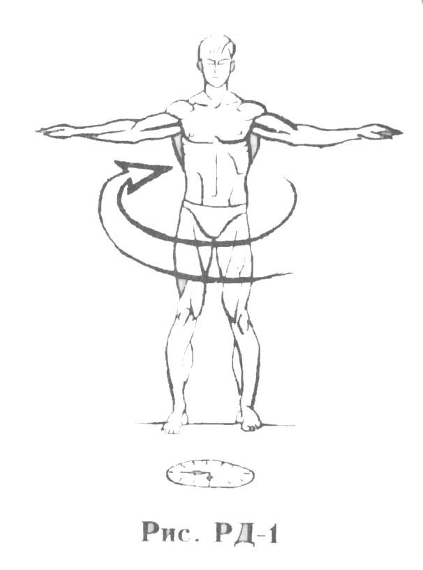 Исходное положение для первого ритуального действия, стоя прямо с горизонтально вытянутыми в стороны на уровне плеч руками. Приняв его, нужно начать вращаться вокруг своей оси до тех пор, пока не возникнет ощущение легкого головокружения. При этом очень большое значение имеет направление вращения — слева направо. Другими словами, если бы вы стояли в центре лежащего на полу большого циферблата, обращенного лицевой стороной вверх, то вращаться нужно было бы по часовой стрелке (Рис. РД - 1).