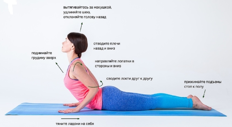 Осваивайте бхуджангасану с ардха бхуджангасаны (позы сфинкса), в которой прогиб позвоночника выражен минимально.