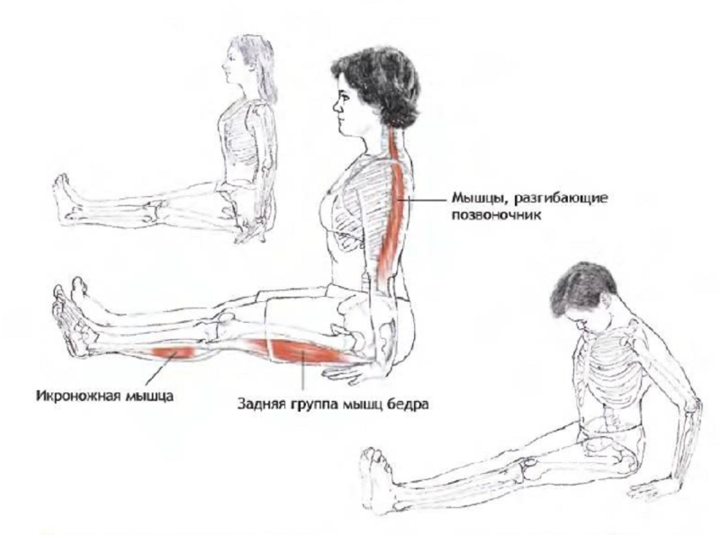 Данная поза ясно демонстрирует, что напряженность мышц ног может привести к сгибанию позвоночника. Препятствующие факторы зачастую служат причиной трудностей и в других, более сложных позах, где они не столь очевидны. Так, например, напряжение мыши ног приводит к опусканию головы, хотя отчасти это может объясняться ограничением свободы движений плеч и позвоночника.