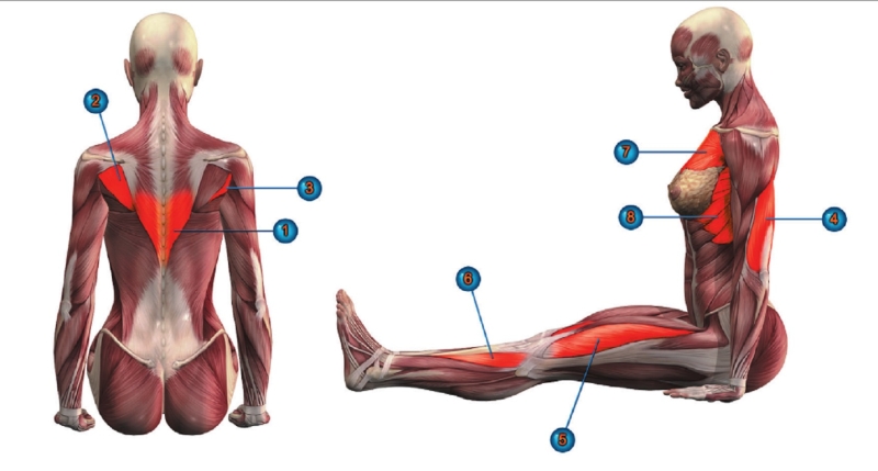 Нейтральное положение позвоночника. В конечной фазе упражнения прямая позиция позвоночника с осевым вытяжением вверх и раскрытие грудной клетки обеспечиваются работой многих мышц шеи и туловища.