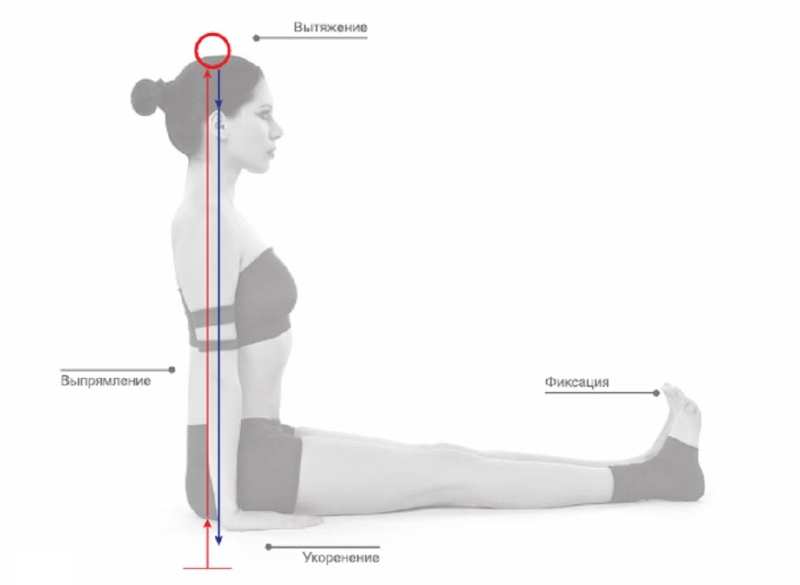 Происходят разгибание коленных и тыльное сгибание голеностопных суставов. Ступни при этом держатся вместе, а пятки тянутся вперед. Вся задняя поверхность ног лежит на полу.