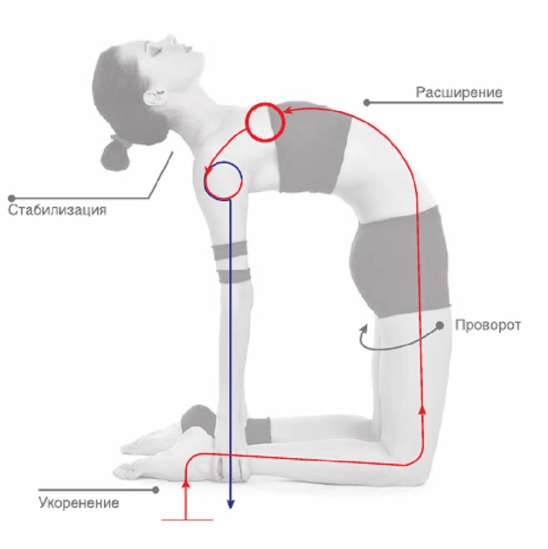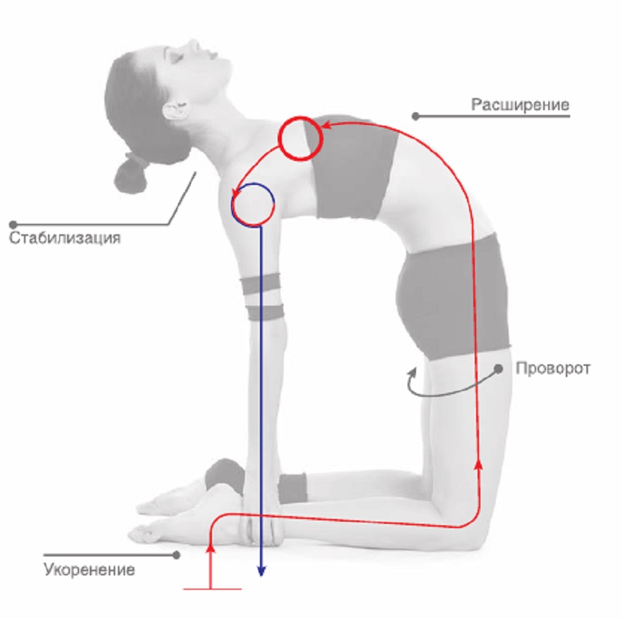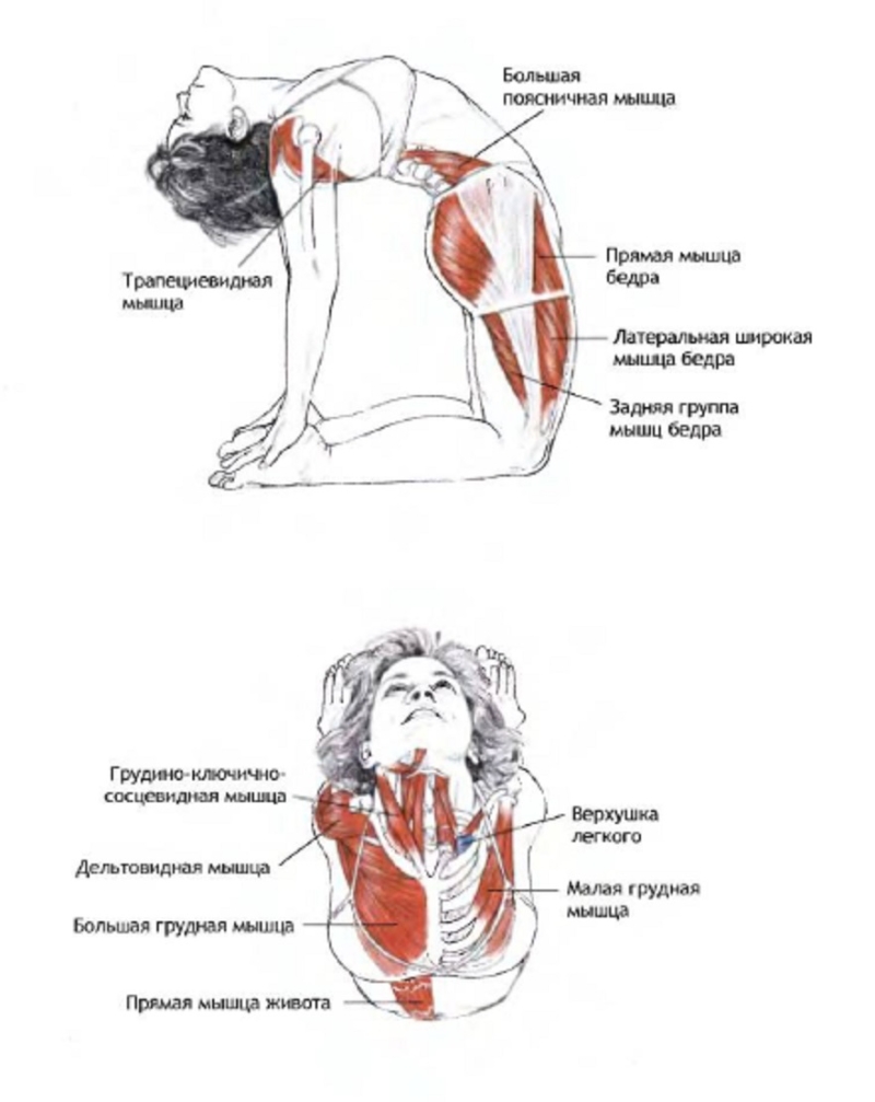 При достаточной гибкости озвоночника глубокое разгибание туловища назад в основном выполняется за счет силы тяжести, а не работы мышц, разгибающих позвоночник. Поскольку нет упора руками, поза удерживается преимущественно за счет напряжения мышц шеи, живота, таза и нижних конечностей (ограничение чрезмерного прогибания шеи и поясницы).