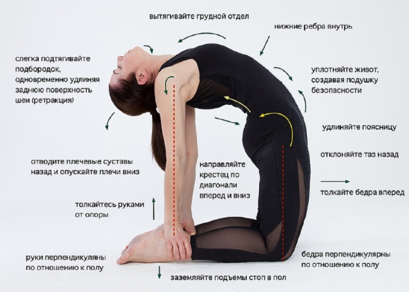 Не заламывайте поясницу. Вытягивайте поясничный отдел позвоночника вверх, работая над прогибом в грудном отделе. Не запрокидывайте голову глубоко назад — это зажимает мышцы шеи, препятствует нормальному кровоснабжению головного мозга и может вызвать головокружение. Не перенапрягайтесь ни мышечно, ни ментально. Следуйте энергетическому потоку и раскрывайтесь ему.