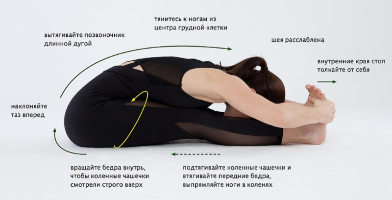 Не тяните голову к ногам, искривляя при этом позвоночник. Корпус выталкивайте вперед за счет движения животом и наклона таза при вытянутом позвоночнике.
