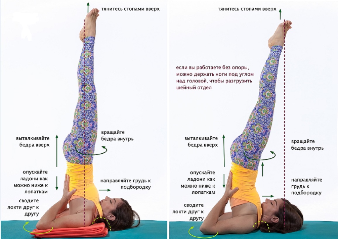 Далее на вдохе, с помощью рук поднимите туловище и выпрямите ноги, разводя бедра, направьте ноги к потолку. Стопы сведите вместе. Выведите корпус в перпендикулярное положение по отношению к полу, поддерживая его руками в области почек. Большие пальцы кистей при этом, направьте наружу, а остальные разверните к позвоночнику. Шея свободна и вытягивается от плеч, вес тела приходится не на шею, а на плечи и локти.