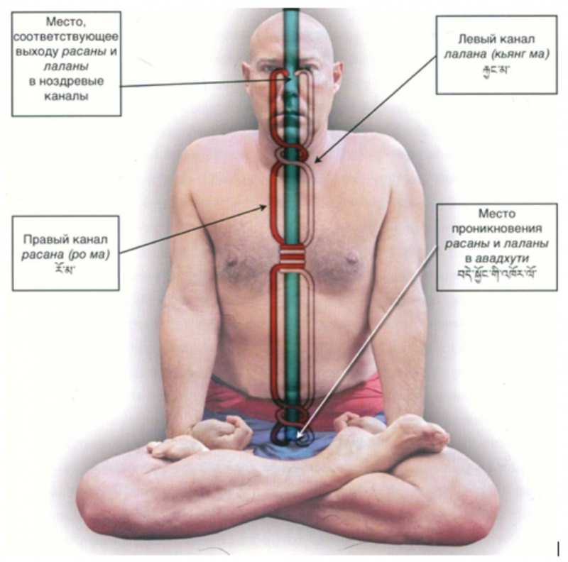 Боковые каналы начинаются у основания ноздрей и именно по ним жизненная энергия вместе с дыханием попадает в тонкое тело. Опускаясь вниз вдоль центрального канала, боковые каналы переплетаются с ним в определённых точках, называемых чакрами или корло (энергетические центры), образуя в месте переплетения две петли (по одной на каждый канал). В районе сердечного сплетения - Дхармачакры - боковые каналы образуют шесть петель (по три на каждый канал). В нижней чакре, называемой на санскрите Муладхара (Нирманачакра) боковые каналы образуют петлю, схожую с тибетской буквой ж", и заканчиваются у входа в центральный канал авадхути. У обычного человека вход в этот канал закрыт и потоки жизненной энергии, циркулирующей по боковым каналам, не могут туда проникнуть. Основной целью практики йоги является открытие "врат" авадхути и направление туда объединённого потока жизненной энергии.