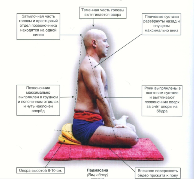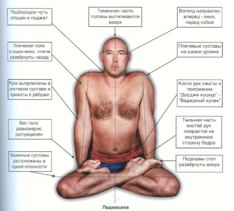 Выпрямляя позвоночник, вытягивайте его вверх, чуть подтягивая к себе подбородок. Зафиксируйте данное положение. Когда Вы примите положение со скрещенными ногами, станет очевидно, что центр тяжести тела, ввиду того что правый коленный сустав не касается пола, смещён вправо. Для исправления этого недостатка возьмите дополнительную подушку или свёрнутый кусок ткани и подложите его под правый коленный сустав. Зафиксируйте это положение. Выровняв положение нижней части тела, обратите внимание на положение плечевого пояса. Опустите плечи вниз, вытягивая голову теменной частью вверх. Ссутуливание в грудном отделе позвоночника недопустимо. Подбородок чуть опущен вниз, взгляд направлен вперёд, в направлении кончика носа.