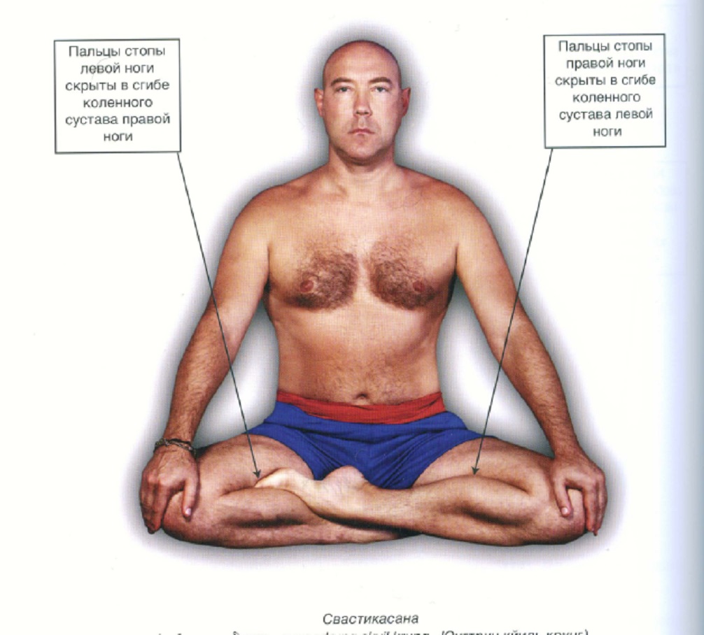 Данная позиция распространена не менее, чем падмасана. Она рекомендуется лицам с ограниченной подвижностью тазобедренного сустава или пожилым практикующим. Положение корпуса в ней практически идентично падмасане, за исключением того, что голени не перекрещиваются, а располагаются одна на другой. Существует два базовых варианта: широкая, когда левая нога располагается чуть ниже икроножной мышцы правой ноги и частично на внутренней стороне правой стопы, и узкая, когда подъём левой стопы лежит на внутренней поверхности бедра правой ноги. В обоих варантах ноги касаются пола всей поверхностью, от коленного сустава до подъёма стопы.