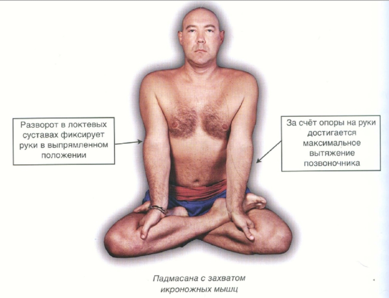 Это положение позволяет в целом добиться эффекта, схожего с падмасаной с упором запястьями. Это одна из позиций, приведённая на фресках храма Лукханг в Лхассе. В этом положении руки выворачиваются в локтевых суставах и охватывают икроножные мышцы у сгибов коленного сустава. Вес тела переносится вперёд, и позвоночник вытягивается как и при упоре запястьями. Для того чтобы свободно просунуть пальцы между икроножной мышцей и бедром, их следует смазать маслом, жиром или кремом.