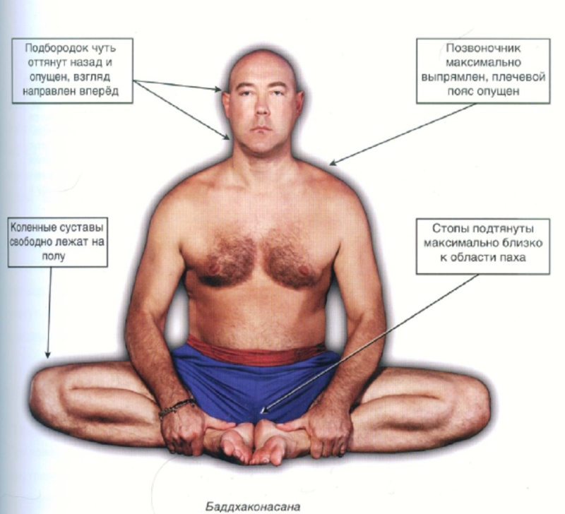 Это ещё один из вариантов позиции для практики как "кувшинного", так и спокойного дыхания. В данном положении, как и во всех предыдущих, позвоночник максимально выпрямлен, стопы обеих ног подтянуты к области паха и развёрнуты вверх. Коленные суставы опущены на пол таким образом, что бёдра и голени находятся в горизонтальном положении. Учитывая, что в данной позиции под таз не следует подкладывать дополнительную опору, особое внимание следует обращать на выравнивание поясничного и крестцового отдела позвоночника, подавая живот вперёд и вытягивая теменную часть головы вверх при одновременном опускании плечевого пояса. Кисти рук захватывают голень и, подтягивая стопы к области паха, контролируют вертикальное положение корпуса.