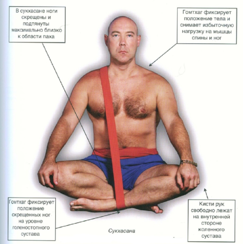 Сукхасана - положение сидя со скрещенными ногами в удобной позе. В тибетской традиции используется название Падма кйиль крунг ( pad ma skyil krung). Используется в случае ослабленного здоровья или при отсутствии возможности принять любую из вышеперечисленных позиций из-за травм. Также рекомендуется лицам, страдающим избыточной полнотой. В этом положении для фиксирования правильного положения позвоночника и снижения нагрузки на мышцы спины рекомендуется использование гомтхага - медитационной ленты длиной около двух метров, связанной в петлю. Она надевается, как показано на рисунке.