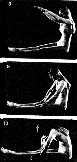 10. Прочно удерживая руками колени, притяните корпус как можно ближе к ногам. Локти вывернуты наружу(это очень важно). Колени остаются прямыми. Почувствуйте растяжение позвоночника, но не напрягайтесь. Неподвижно удерживайте позу. Оставайтесь в положении максимального для вас наклона 20 секунд. Медленно вернитесь в исходное положение. Свободно опустите руки на колени.