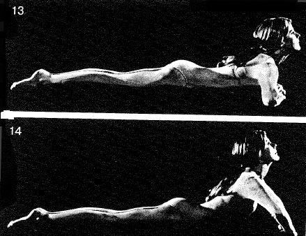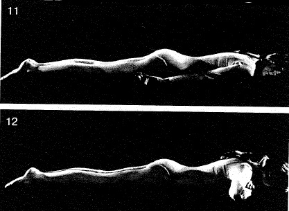 Сохраняя прогиб в позвоночнике, медленно опустите корпус. Медленно наклоните голову вперед. Вернитесь в исходное положение, показанное на илл. 12. Затем вернитесь в положение, показанное на илл. 11.