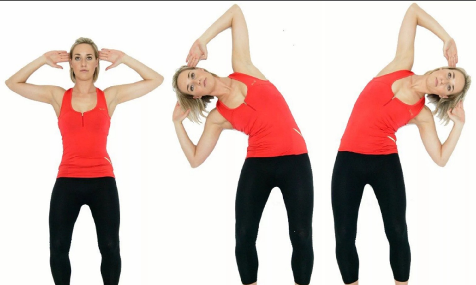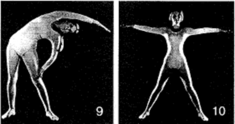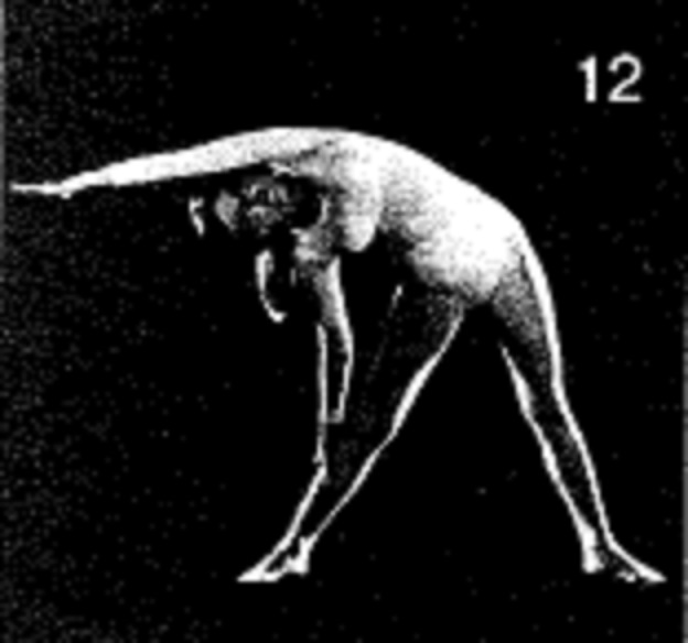 12. Выполните те же движения вправо. Me забывайте о плавности движений. Колени остаются прямыми. Левая рука не сгибается в локте. Удерживайте позу 15 секунд. Медленно вернитесь в вертикальное положение. Медленно опустите руки вдоль тела. Плавно сведите ноги вместе. Расслабтесь.