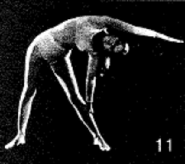 11. Медленно наклонитесь влево, как и прежде, но на этот раз прочно захватите икру ноги (обратите внимание на усилившееся давление на внутренние поверхности бедер). Не опускайте руку ниже икры. Колени остаются прямыми. Заведите правую руку за голову как можно дальше.