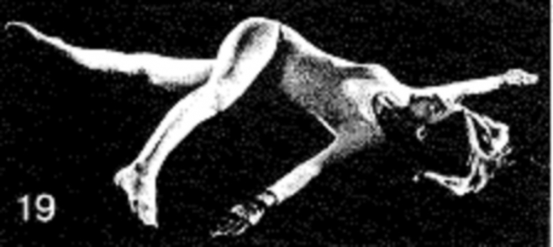 19. Медленно отклоните правую ногу и опускайте ее влево. Постарайтесь достать до пола. Оба плеча не отрываются от пола. Подтяните ногу как можно ближе к голове. Колено не сгибается. Неподвижно удерживайте позу 10 секунд. Верните правую ногу в положение,показанное на илл. 18.