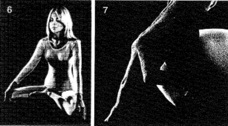 5. Подтяните к себе правую ногу, удерживая правую ступню обеими руками. Положите ступню на левое бедро или на сгиб правой ноги (как вам удобнее). Если вы пока не можете принять эту позицию, вернитесь к простой позе со скрещенными ногами. Сидите прямо, но не зажимайтесь (что очень важно). Кисти рук положите на колени; пальцы находятся в положении, показанном на илл. 7. Опустите веки.