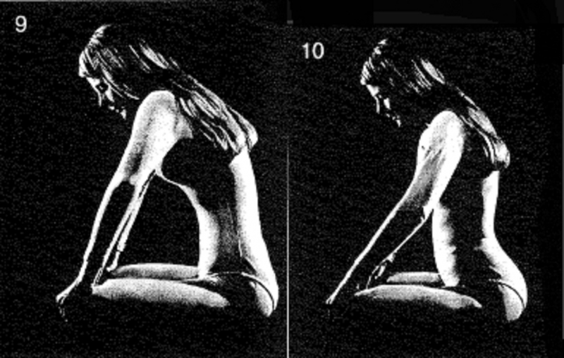 Теперь сделайте медленный и бесшумный глубокий выдох, расслабляя на выдохе плечи и грудную клетку и втягивая живот, как показано на илл. 9. По завершении выдоха повторите упражнение еще раз.