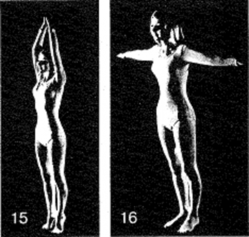 15. Продолжайте глубокий вдох, расширяя грудную клетку. Поднимите руки над головой, соединив ладони, одновременно высоко поднимаясь на носки. Движения этого упражнения выполняются в сочетании с только что разученным "Полным дыханием". Удерживайтесь в крайнем положении как можно более устойчиво 5 секунд.