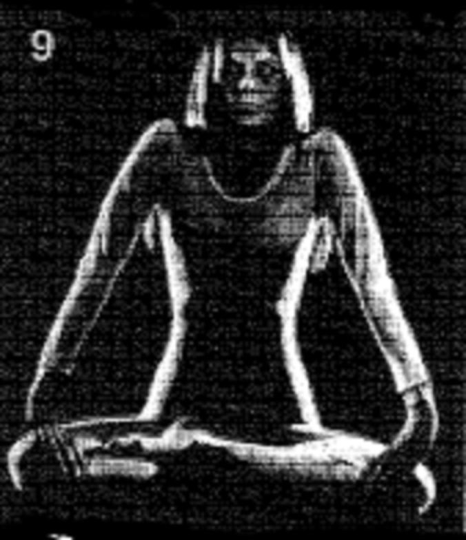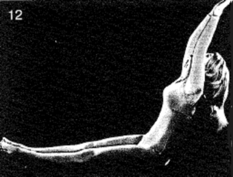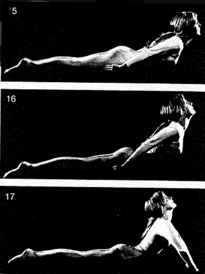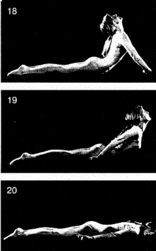 15. Лоб опущен на пол, как в ранее разученном варианте. Руки вдоль тела. На этот раз голова и корпус приподнимаются без помощи рук.