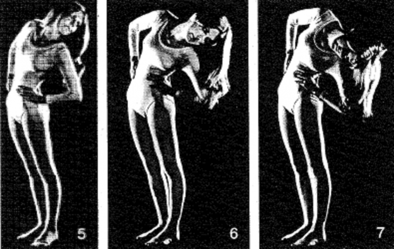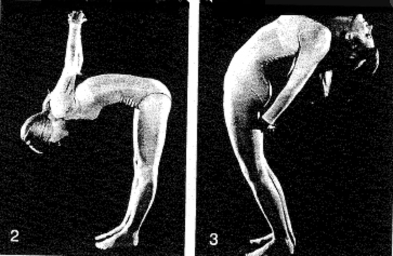 3. Теперь мы выполним это упражнение в крайнем положении. Медленно прогнитесь в талии как можно сильнее назад без напряжения. Если это положение кажется слишком трудным для вас, вернитесь к промежуточной позиции. Глаза остаются открытыми. Колени не сгибаются. Неподвижно удерживайте позу не более чем 5 секунд.