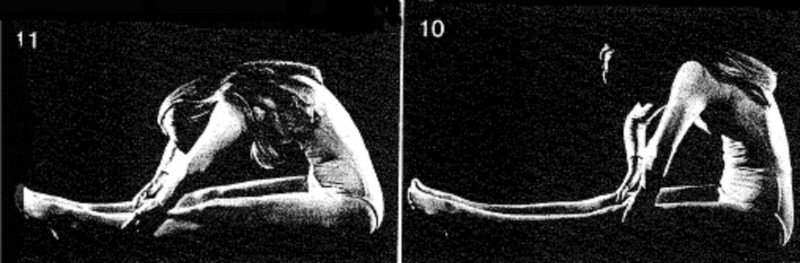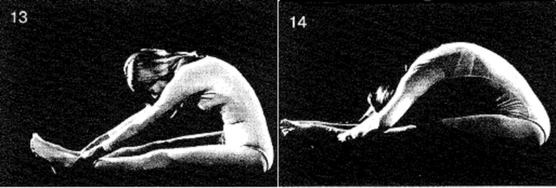 13-14 Попытайтесь захватить лодыжки и подтянуть корпус как можно ниже к ногам. Лоб обращен к коленям. Локти вывернуты наружу. Колени остаются прямыми. Не напрягайтесь. Неподвижно удерживайте позу в крайнем положении (как можно ниже, насколько вам удается нагнуться на сегодня) 20 секунд. Медленно вернитесь в вертикальное положение.