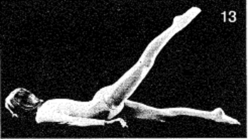13. Надавите кулаками в пол. Очень медленно поднимите левую ногу как можно выше. Удерживайте позу 5 секунд. Медленно опустите ногу. Очень медленно поднимите правую ногу как можно выше. Удерживайте позу 5 секунд. Медленно опустите ногу. Повторите движения каждой ногой по 1 разу. На несколько мгновений расслабьтесь.