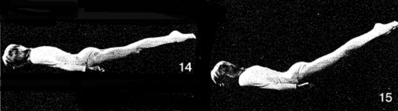 15. Сделайте неглубокий вдох и задержите дыхание. Надавите кулаками в пол. Попытайтесь поднять обе ноги несколько выше, чем в предыдущем положении. Удерживайте позу 5 секунд. На выдохе медленно опустите ноги; расслабьтесь. Повторите 1 раз.