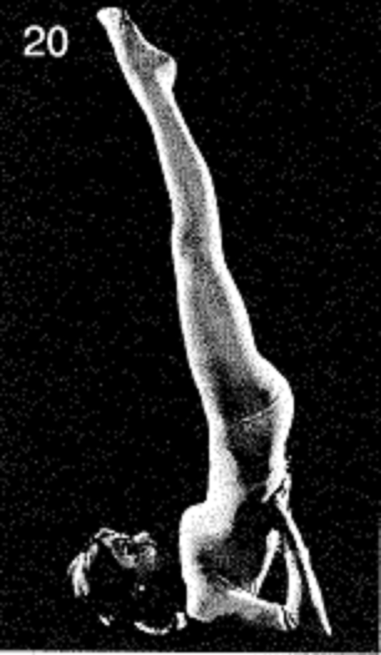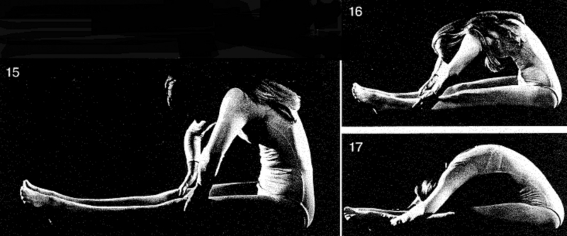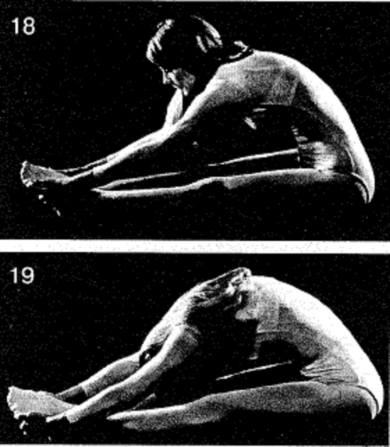 19. Нагнитесь вперед как можно сильнее. Локти не нужно выворачивать наружу, как вы делали это прежде. Колени остаются прямыми. Неподвижно удерживайте крайнее положение (наклоняясь как можно ниже, насколько вам удается на сегодняшний день) на 20 счетов. Если эта поза слишком трудна для вас, вернитесь к менее крайней позиции. Медленно вернитесь в вертикальное положение. Повторите упражнение в крайнем положении 1 раз.