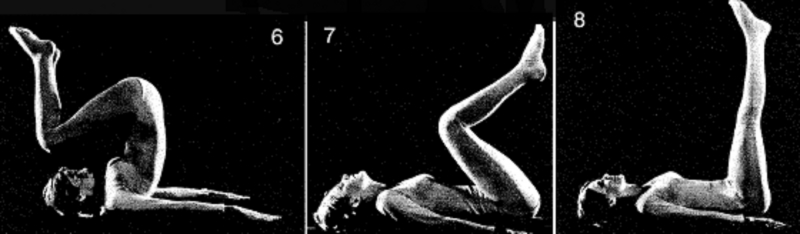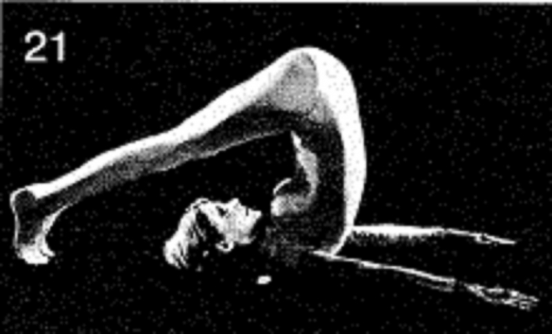14. Перекатитесь вперед, прогибая шею, чтобы удержать затылок прижатым к полу. Когда бедра коснутся пола, выпрямите ноги вверх. Расслабьтесь примерно в течение 1 минуты. Повторите 1 раз.
