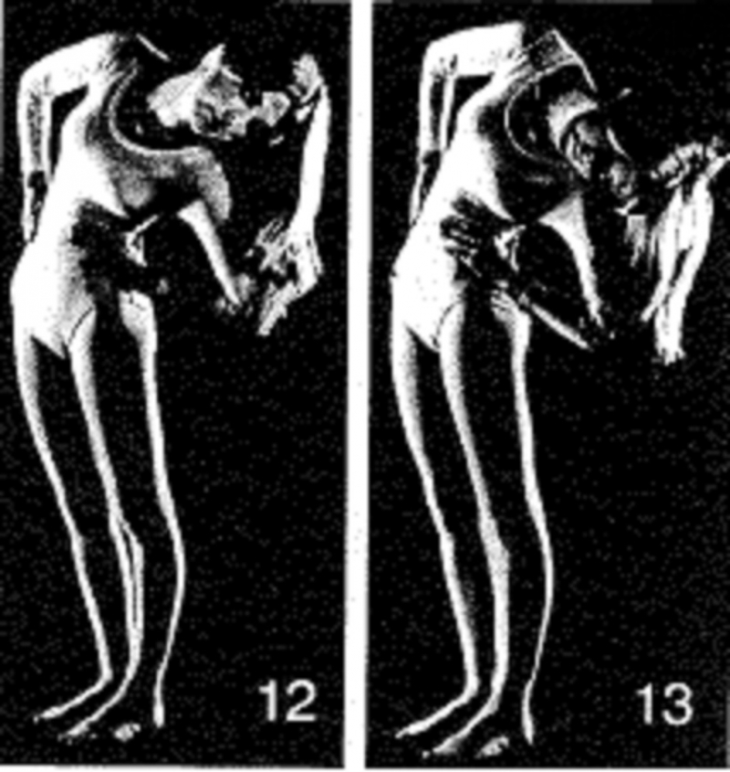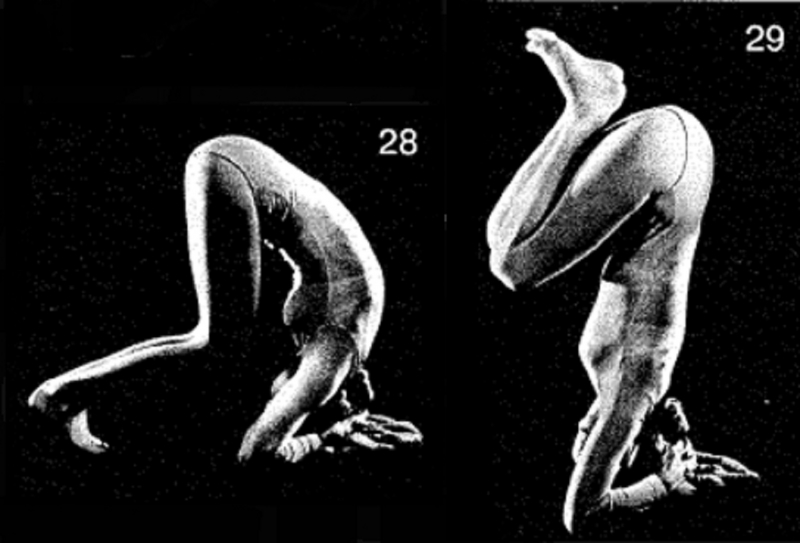 28-29 Попытайтесь принять позицию, изображенную на илл. 29. Удерживайте позу не более чем на 15 счетов. Если вы пока не можете сделать это, вернитесь к позиции на илл. 28. Удерживайте позу на 45 счетов. Расслабьтесь с опущенной головой.