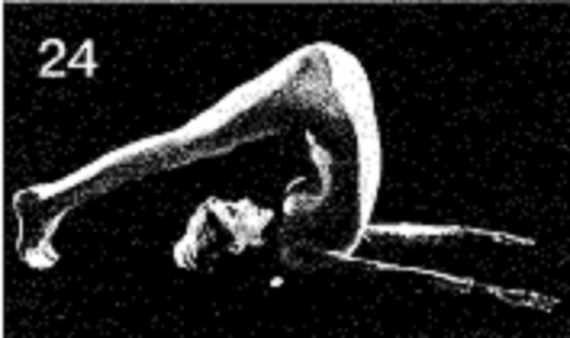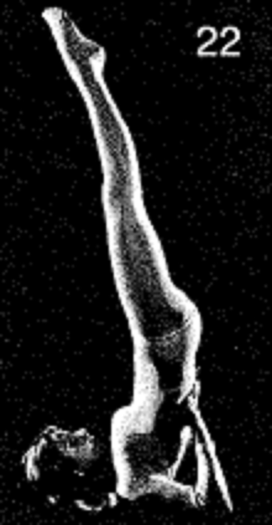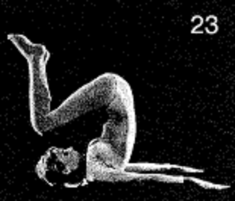 22. Выполните Позу свечи в крайнем для вас положении. Увеличьте время удержания перевернутой позы до 105 счетов (1 минута 45 секунд). Не удерживайте позу дольше. На сегодня вы должны быть способны выпрямить корпус до положения, близкого к изображенному на илл. 22.