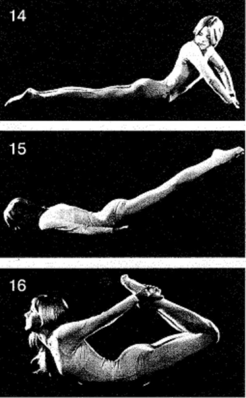 14-15-16. Сегодня мы объединим эти три интенсивных упражнения для позвоночника и мышц спины в единый комплекс. Обратите внимание, что во всех трех упражнениях тело принимает сильно изогнутое положение; иными словами, позвоночник прогибается вовнутрь. Поза саранчи служит для развития как позвоночника, так и мышц спины. Когда вы поднимаете ноги в крайнее положение в этой позе, воздействие оказывается на поясничный отдел. Выполните комплекс трижды
