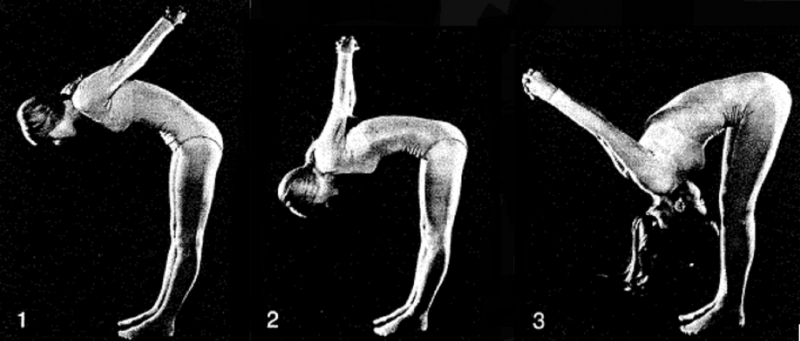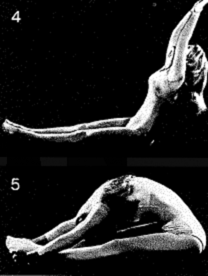 1-2-3. Выполните упражнение по 1 разу в каждой из трех позиций. Предпримите сегодня серьезную попытку подтянуть лоб как можно ближе к коленям (или коснуться их) в крайнем положении. Заведите руки далеко за спину. Считайте до 10 в каждом положении прогиба назад и до 20 в каждом положении наклона вперед. По завершении расслабьтесь. Сегодня мы не будем выполнять движения ногами.