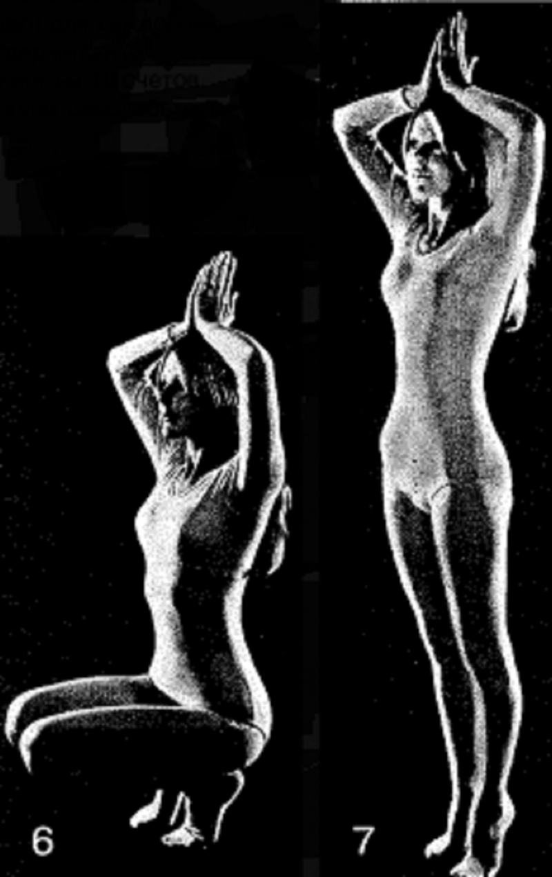 Двигайтесь очень медленно, глубоко сосредоточившись на всех движениях; позы должны плавно перетекать друг в друга, подобно замедленному балету. Положения сидя, положения лежа, перекатывания и т. д. — все это становится частью комплекса, выполняемого в виде медленных плавных движений.