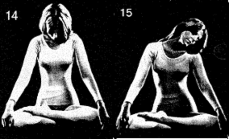 14-15. Сегодня мы выполним это упражнение, дважды против часовой стрелки (перекатывая голову сначала влево, как мы делали это прежде) и добавим два круга по часовой стрелке (двигаясь сначала вправо). Удерживайте каждое положение на 5 счетов. Ненадолго расслабьтесь.