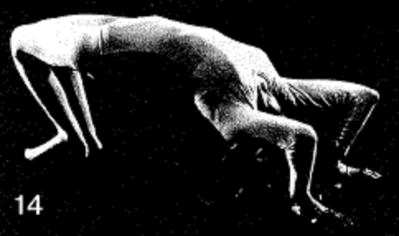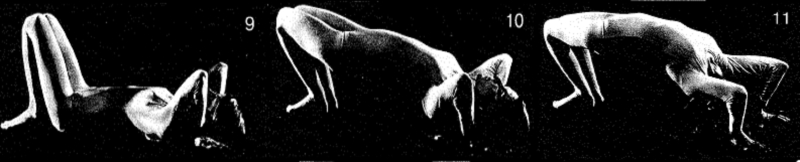 11. Снова упираясь в пол руками и ногами, прогните шею и упритесь макушкой в пол. Поднимите корпус как можно выше. Держите колени вместе. Неподвижно удерживайте позу на 10 счетов. Медленно опустите корпус на пол, расслабьтесь. Повторите всю последовательность со средним подъемом, а затем с максимальным подъемом, дважды.