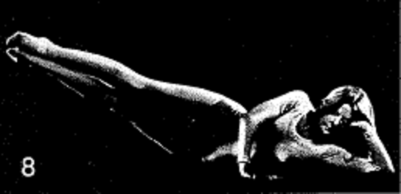 16. Выполните упражнение 1 раз в крайнем для себя положении, без удержания. Плавно перекатитесь на левый бок. По завершении глубоко расслабьтесь, положив голову щекой на пол и осознавая все, что происходит в теле. Не позволяйте сознанию блуждать.