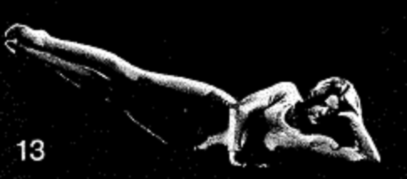 12. Сначала выполните упражнение по 1 разу для каждой ноги. Удерживайте позу на 10 счетов. Затем выполните упражнение с подъемом в среднее положение (ноги поднимаются на небольшое расстояние от пола), 1 раз. Удерживайте позу на 10 счетов. И наконец, дважды выполните позу в крайнем для себя положении. Удерживайте каждый подъем на 7 счетов. Делайте короткие паузы между повторами. По завершении расслабьтесь.