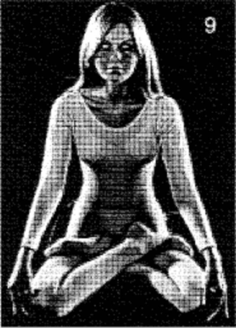 9. Так выглядит полная Поза лотоса. Попытайтесь положить правую ступню на левое бедро. Внимательно изучите иллюстрацию. Спина прямая. Веки опущены. Кисти и пальцы рук принимают показанное положение. Удерживайте позу не более чем на 10 счетов. Выйдите из позы с помощью рук и вытяните прямые ноги перед собой. Попытайтесь принять Позу лотоса, поменяв ноги местами (левая ступня лежит на правом бедре) Удерживайте позу на 10 счетов. Вытяните ноги вперед; расслабьтесь.