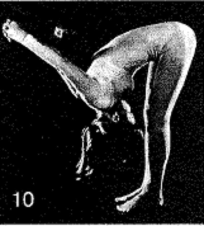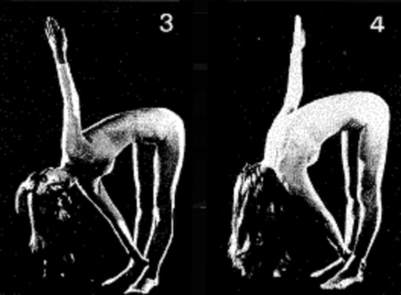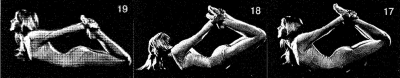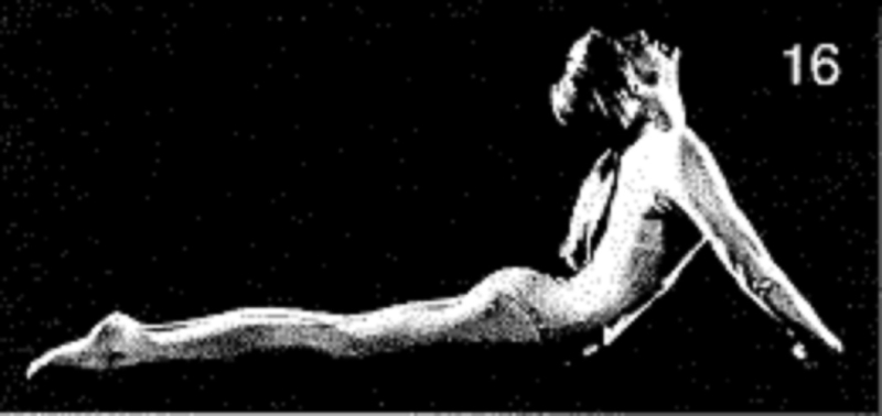 16. Выполните всю последовательность, включая скручивающие движения, 1 раз. Удерживайте подъемы в крайнем положении на 30 счетов (голова откинута назад; сильный прогиб в спине), а скручивающие движения — 10 счетов каждое. Глубоко расслабьтесь, положив щеку на пол.