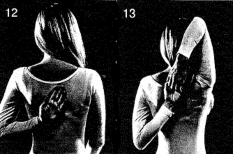 Повторите движения вниз и вверх дважды, удерживая каждое на 5 счетов. Поменяйте положение рук. Правая ладонь обращена тыльной стороной к спине. Левая ладонь кладется сверху и захватывает правую. Выполните те же движения вверх и вниз 3 раза. Расслабьтесь.