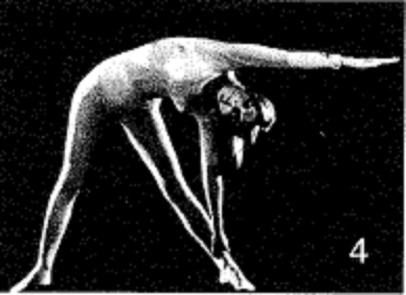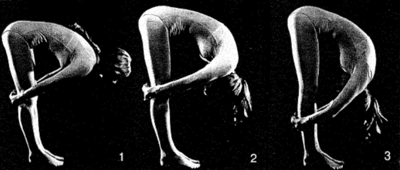 1. Встаньте прямо; пятки вместе Медленно наклонитесь вперед. Отведите руки назад и сцепите их за коленями.