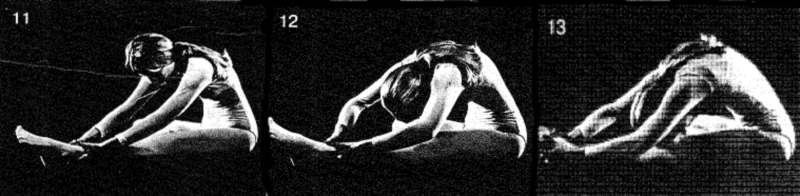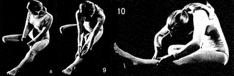 Вытяните правую ногу. Уприте подошву левой ступни во внутреннюю поверхность, правого бедра как можно выше. Выполните те же движения, захватывая правую икру, лодыжку и ступню. Удерживайте каждое положение на 10 счетов. Вернитесь в вертикальное положение. Вытяните левую ногу. Расслабьтесь с вытянутыми ногами.