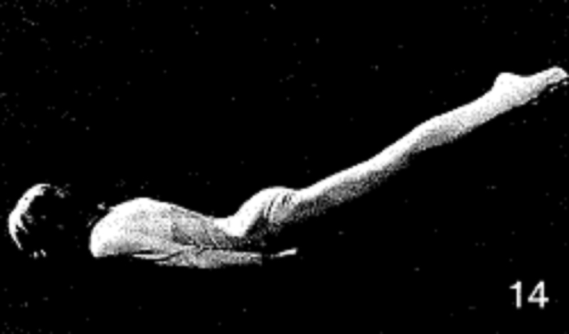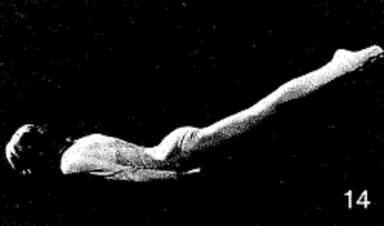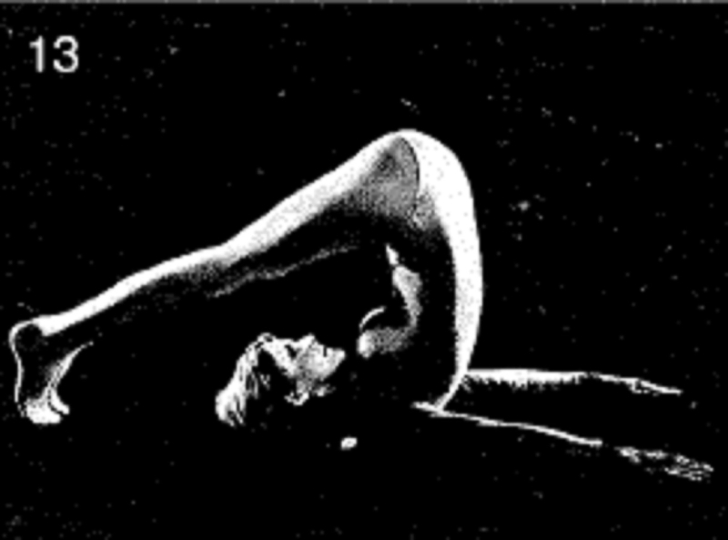 13. Удерживайте крайнее для вас положение на 30счетов. Не удерживайте позу дольше. Выходите из позы, строго следуя инструкциям. Добивайтесь плавности движений и держите голову на полу. Расслабьтесь, лежа на спине.
