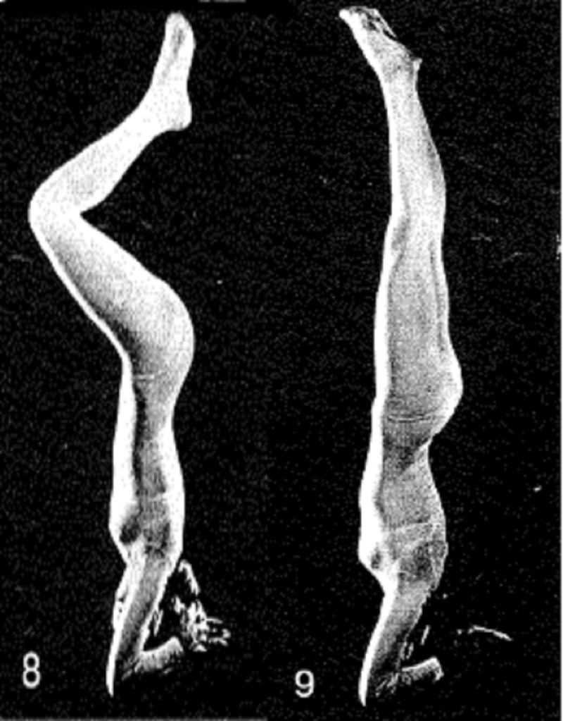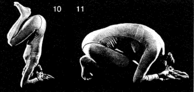 10-11. Выходите из позы, выполняя движения в обратном порядке. Держите колени близко к грудной клетке. Медленно опускайте ноги, сохраняя контроль; не выходите из позы, «рухнув» на пол и ударяясь об пол ступнями. Отдохните с опущенной головой, как и прежде, в течение 1 минуты.