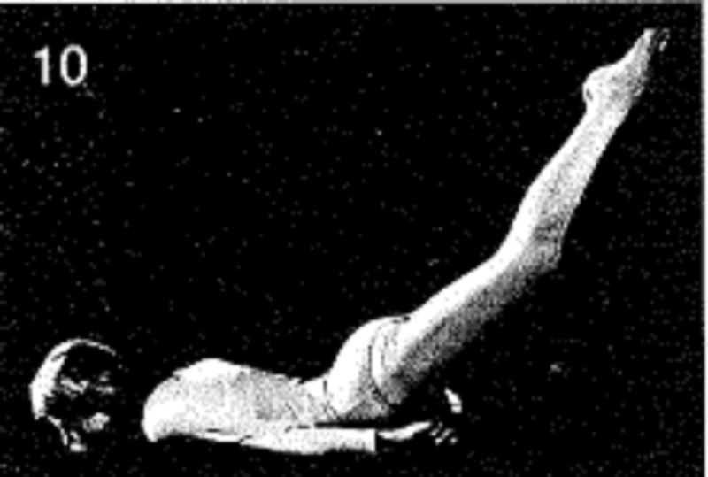10. Выполните упражнение для каждой ноги по отдельности, а затем для обеих ног в среднем положении по 1 разу. Удерживайте каждый подъем на 10 счетов. В усложненном варианте позы колени сгибаются, что позволяет области паха оторваться от пола. Удерживайте позу на 10 счетов.