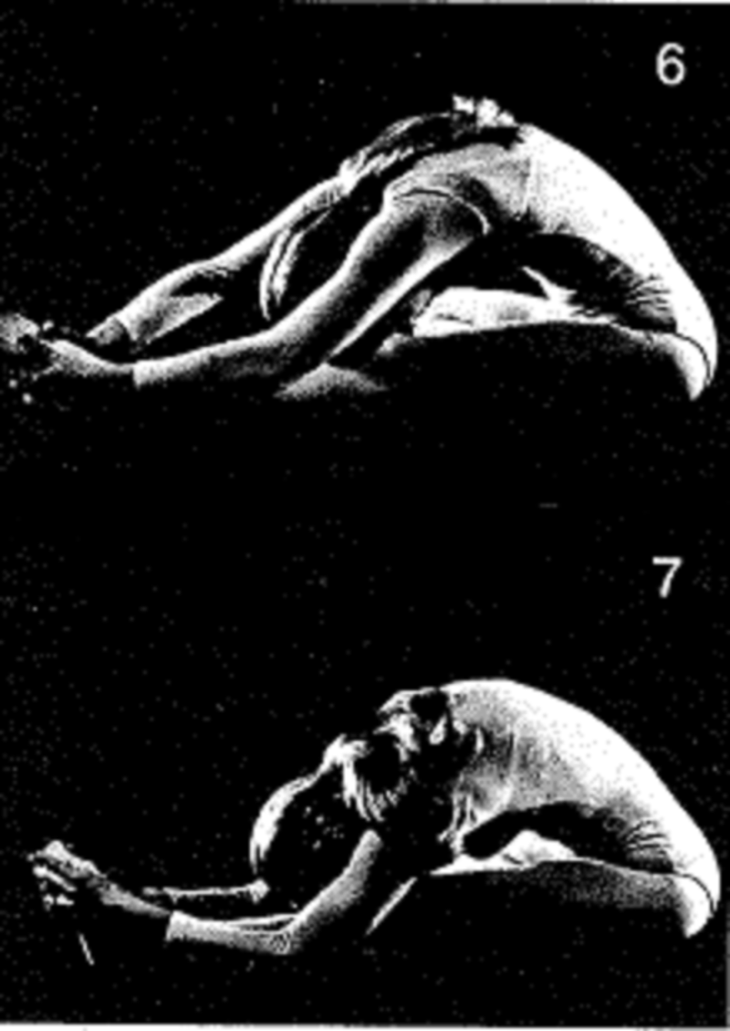 7. Сосчитав до 15 в позиции, изображенной на илл. 6, опустите локти к полу. Удерживайте позу на 10 счетов. Вернитесь в вертикальное положение и расслабьтесь. Выполните упражнение по 1 разу в тех же трех позициях для правой ноги. Удерживайте каждое растяжение на 15 счетов. Затем опустите локти к полу и удерживайте наклон на 10 счетов. Вернитесь в вертикальное положение и расслабьтесь.